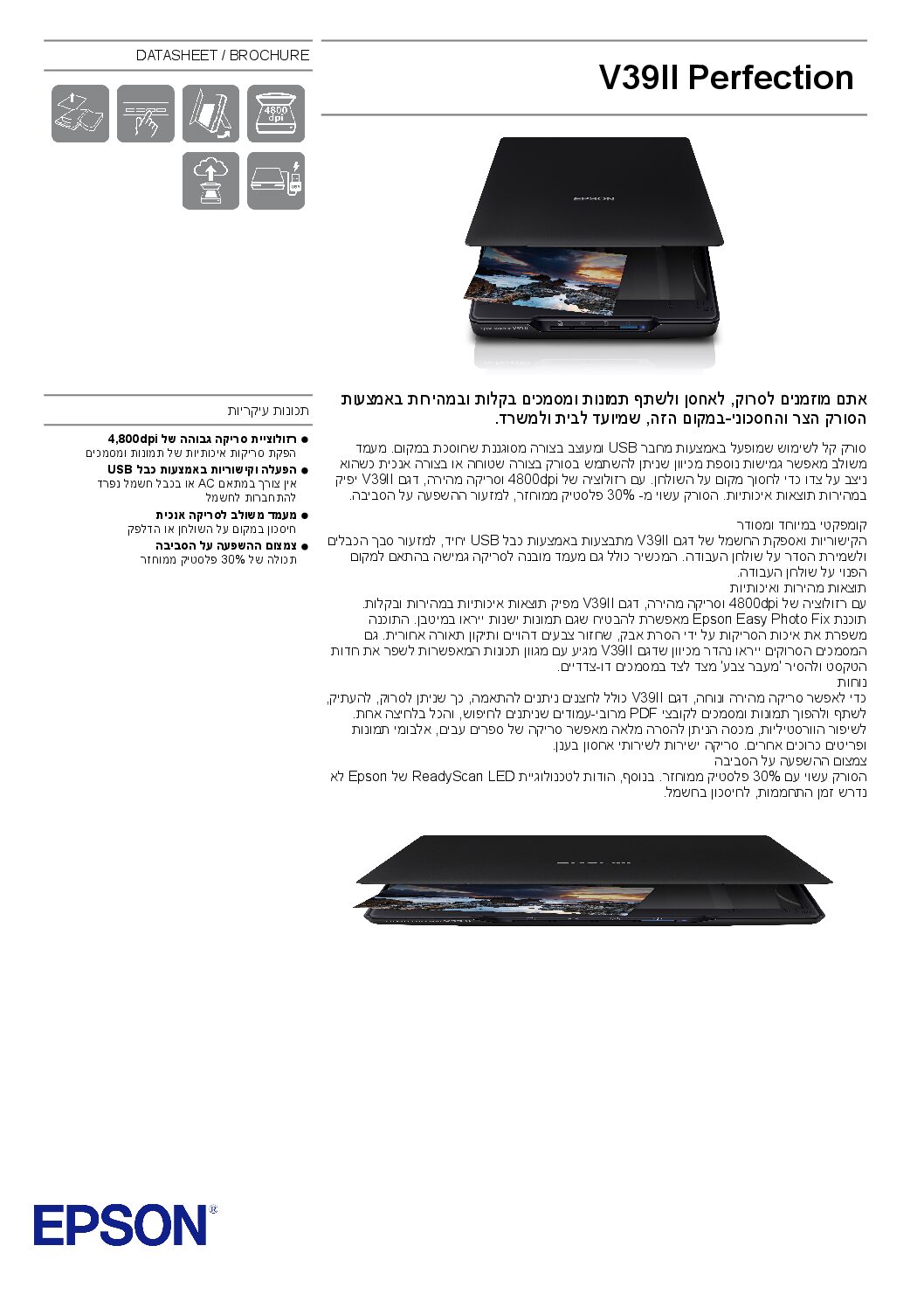 סורק קל לשימוש שמופעל באמצעות מחבר USB ומעוצב בצורה מסוגננת שחוסכת במקום. מעמד משולב מאפשר גמישות נוספת מכיוון שניתן להשתמש בסורק בצורה שטוחה או בצורה אנכית כשהוא ניצב על צדו כדי לחסוך מקום על השולחן. עם רזולוציה של 4800dpi וסריקה מהירה, דגם V39II יפיק במהירות תוצאות איכותיות. הסורק עשוי מ- 30% פלסטיק ממוחזר, למזעור ההשפעה על הסביבה.